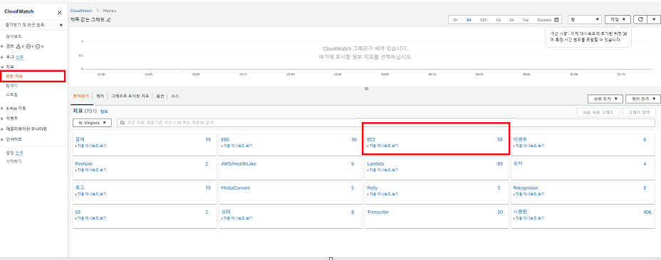 그럼 이제 AWS Consol에서 CloudWatch를 검색하고 클릭을 합니다. 페이지 왼쪽에 있는 탐색 창의 지표를 클릭 하고 모든 지표를 클릭 한 후 EC2를 클릭 합니다.