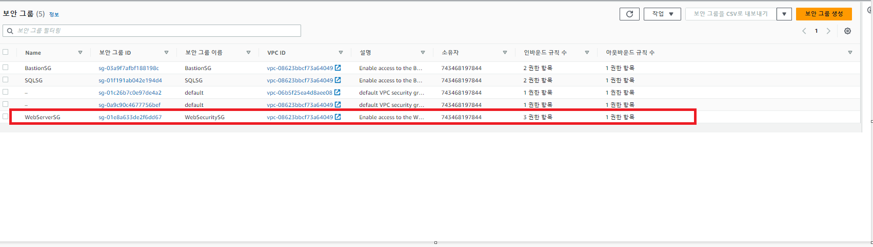 그럼 설정되어 있는 보안 그룹의 리스트가 나타나는데 여기서 WEB Server의 보안 규칙을 확인 하기 위해 WebserverSG를 클릭을 하고 인바운드 규칙 텝을 클릭을 합니다.