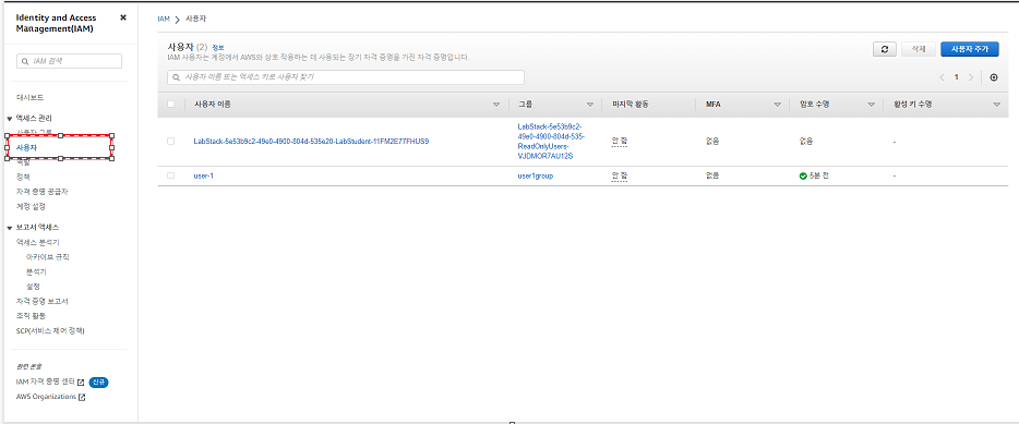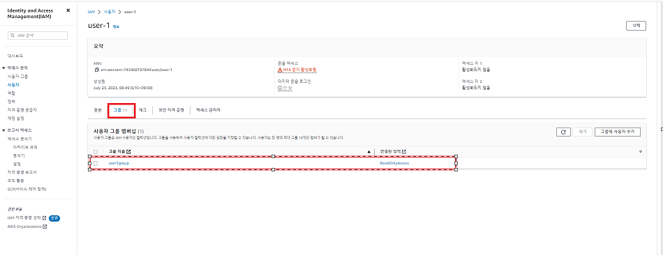 여기서 사용자가 가진 액세스 키의 수, 액세스 키가 생성된 시기, MFA(Multi-Factor Authentication) 디바이스가 할당되었는지 여부 등을 확인할 수 있습니다.