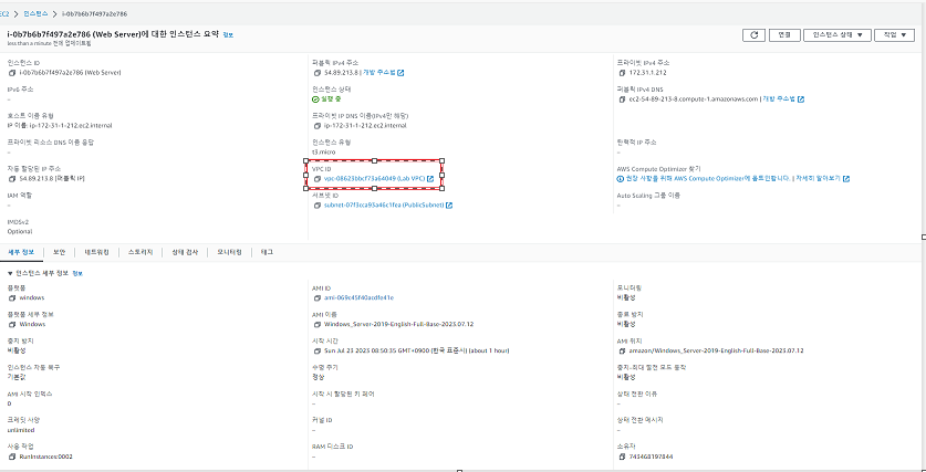 이제 VPC의 보안 검토를 위해 위의 화면 왼족에서 인스턴스를 클릭을 하고 Web Server를 클릭 합니다.
