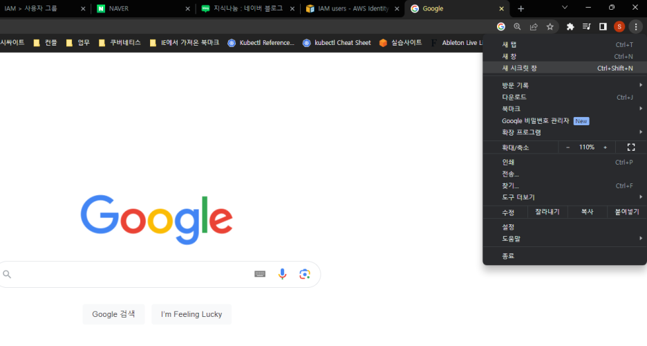 이제 크롬브라우저를 열고 아래 화면과 같이 새 시크릿 창을 클릭을 하고,, 앞에서 복사해 두었던 url을 주소창에 붙여 넣습니다.