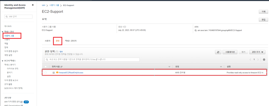 ec2-support그룹에는 AmazonEC2ReadOnlyAccess 정책이 연결되어 있습니다.