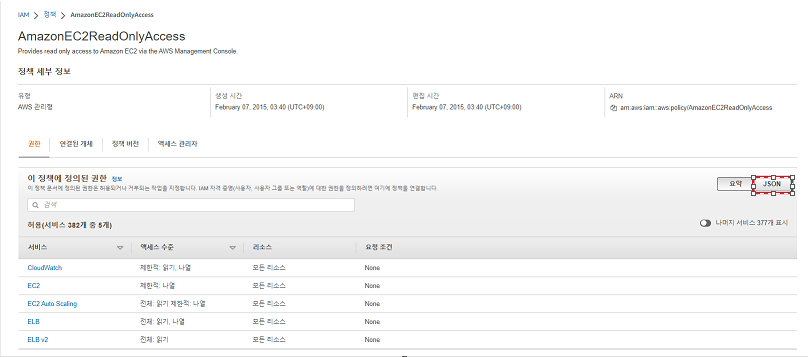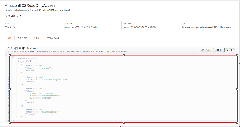 이 정책은 EC2 Instance에 읽기 권한만 할당을 해주는 정책 입니다. 정책이 업데이트되면 정책에 대한 변경 사항이 정책에 연결된 모든 사용자 및 그룹에 즉시 적용됩니다.