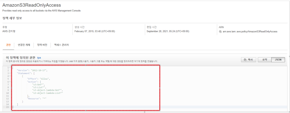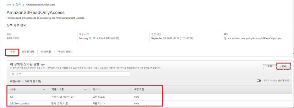 이 그룹에는 AmazonS3ReadOnlyAccess 정책이 연결되어 있습니다. 이 정책은 S3(Storage)에 읽기 권한을 가지고 접속 가능하게 해주는 정책이 연결이 되어 있습니다. 그럼 코드로 살펴 보려면. 위의 화면에서 JSON을 클릭 합니다.