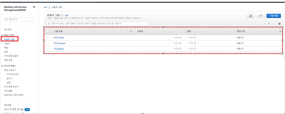 그럼 이제 왼쪽 탐색 창에서 User Groups를 클릭을 하고 s3-support 그룹을 클릭을 합니다.