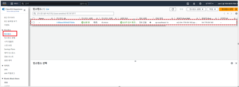 로그인 후에 AWS 콘솔창에서 EC2를 검색핸 후 화면 왼쪽의 인스턴스를 클릭 하면 아래와 같이 EC2인스턴스를 볼수 있습니다.