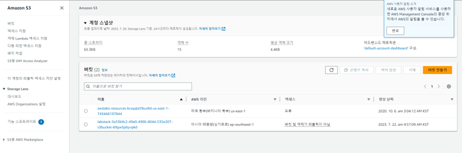 그럼 AWS 콘솔 화면이 나오고, 여기서 S3를 검색 후 클릭을 합니다. 그럼 S3 버킷 정보를 아래 화면과 같이 볼수 있습니다.