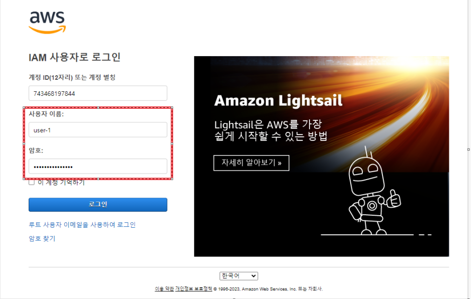 그럼 이제 로그인 화면이 나오는데요. 여기서 앞서 사용한 user-1을 이용해 user-1이 소속된 그룹에 할당된 정책과 같이 동작을 하는지 확인을 해보겠습니다.