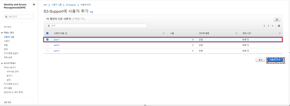 그럼 이제 user-1이 s3-support 그룹에 추가된 것을 확인 할수 있습니다. 그럼 이제 위의 표에서와 같이 각 사용자를 각 그룹에 위와 같은 절차로 추가를 합니다.