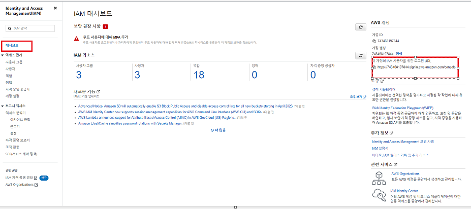 그럼 아래 그림과 같이 화면 왼쪽의 데쉬보드 메뉴를 클릭 합니다. 클릭을 하면 화면 오른쪽과 같이 iam사용자가 로그인할 수 있는 url이 있습니다. 이 url을 메모장에 복사해 둡니다.