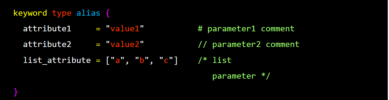 테라폼 문법은 위의 그림과 같이 keyword type alias 그리고 블럭 안의 key와 값들로 구성이 되는데요