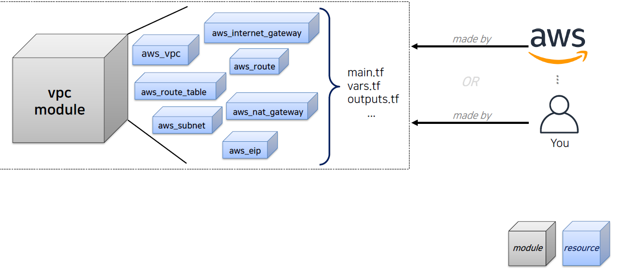 다음으로 module 블럭이 있는데요. 이 모듈은 여러가지 resouce를 하나의 module로 묶어서 필요할 때마다 한꺼번에 reouirce를 생성 및 삭제등의 작업 편리하게 해주는 블럭 입니다.
