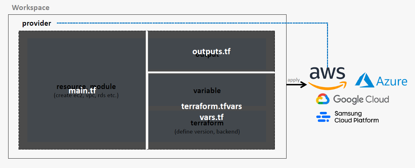Terraform은 위의 그림처럼 구성이 되어 있습니다. 각 부분을 Sofrware의 Block로 생각을 하면 될거 같은데요.