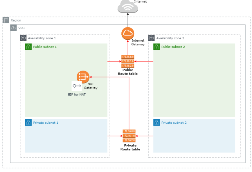 우선 전체 적인 인프라 구성은 위외 같습니다. VPC 1개, Subnet 4개, Routing table 2개, IGW, NAT를 구성 해보겠습니다.