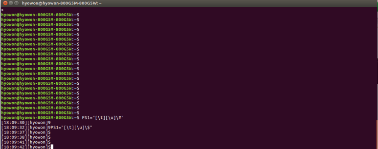 그리고 사용자가 프롬프트 형식을 변경을 하고 싶으면 아래 그림과 같이 PS1이나 PS2 변수에 바꿀 형식을 입력하면 바뀌게 됩니다. 예로 프롬프트 형식을 현재시간:사용자이름 형식으로 변경해 보겠습니다.