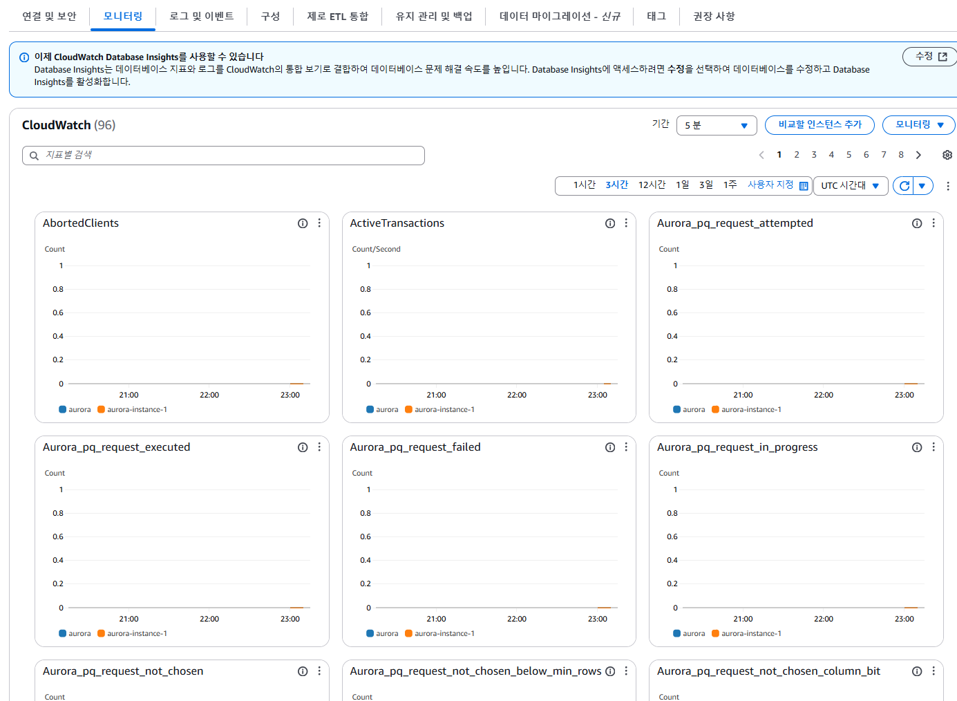 - Monitoring 탭에서 데이터베이스의 다음 항목에 대한 지표를 모니터링할 수 있습니다.