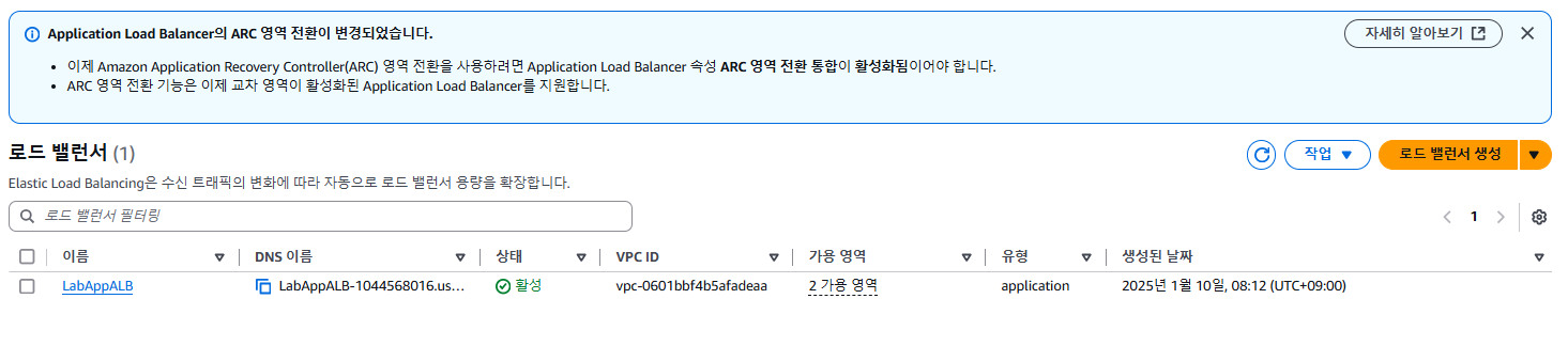 Successfully created load balancer: LabAppALB 메세지가 화면 상단에 표시됩니다.