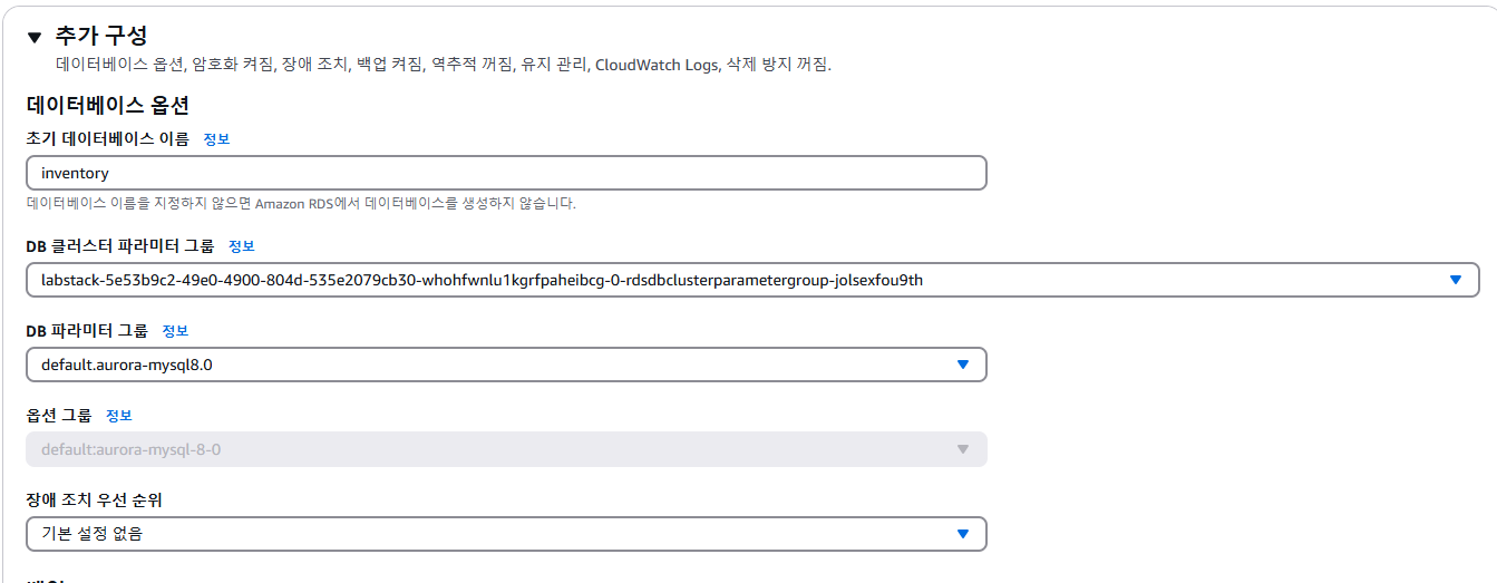 - DB cluster parameter group: 이 실습 지침 왼쪽의 DBClusterParameterGroup 값과 일치하는 값을 드롭다운 메뉴에서 선택합니다.