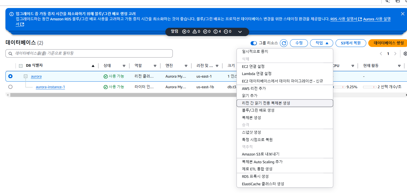 - Actions 를 선택하고 Create cross-Region read replica를 선택합니다.