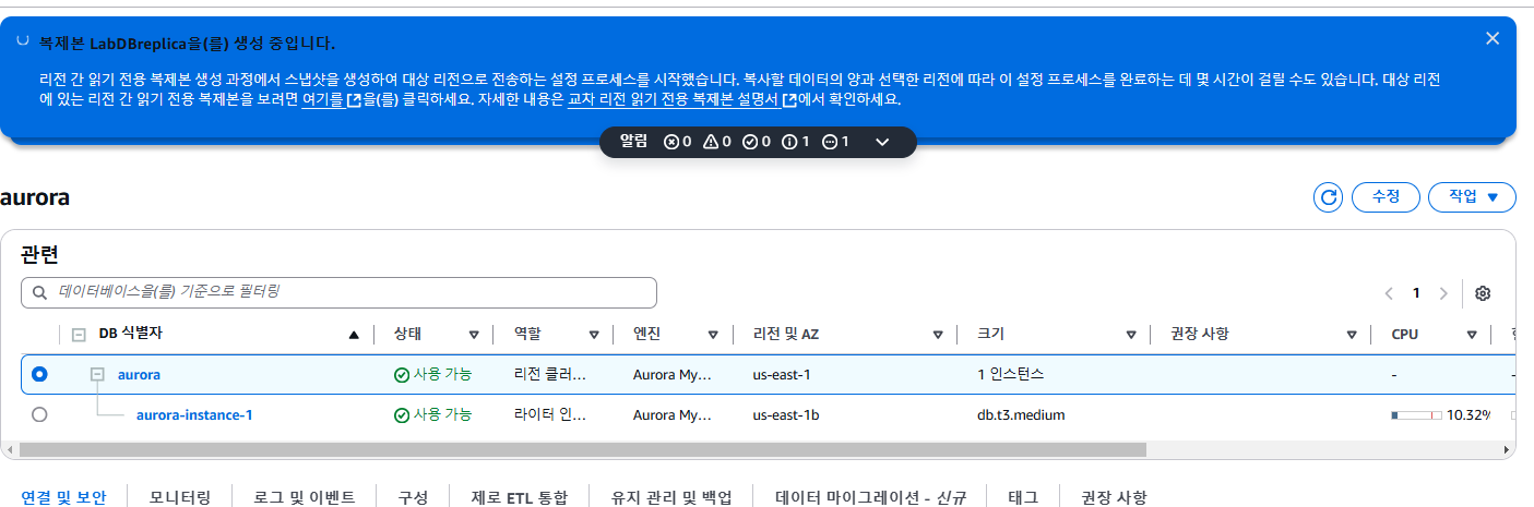 Your Read Replica creation has been initiated. 메세지가 화면 상단에 표시됩니다.