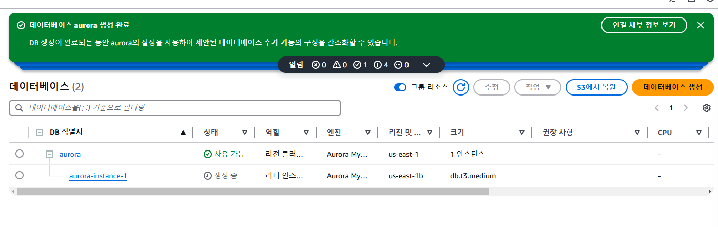 Aurora MySQL DB 클러스터 시작 프로세스가 진행됩니다. Amazon RDS 인스턴스가 시작되려면 최대 5분이 걸릴 수 있습니다. 하지만 기다리지 않고 다음 과제로 진행해도 됩니다.