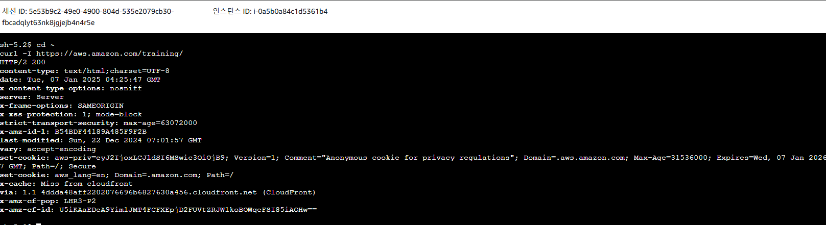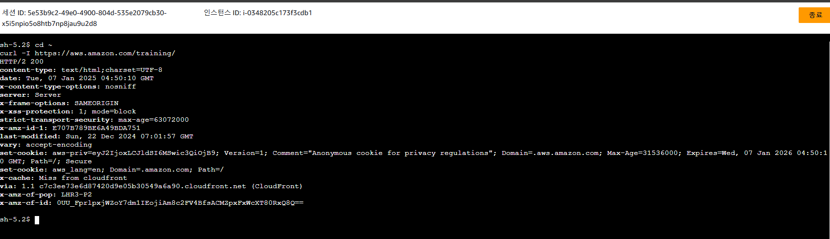 - 명령: 다음 명령을 입력하여 홈 디렉터리(/home/ssm-user/)로 변경하고 cURL 명령을 사용하여 웹 연결을 테스트합니다.