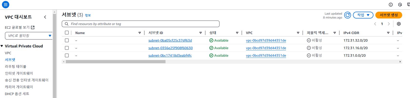 You have successfully created 1 subnet: subnet-xxxxxx 메세지가 화면 상단에 표시됩니다.