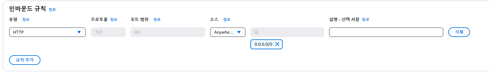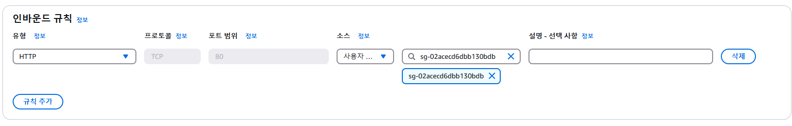 추가 정보: 보안 그룹을 규칙의 소스로 지정하면 지정된 프로토콜과 포트의 경우, 소스 보안 그룹과 연결된 네트워크 인터페이스에서 오는 트래픽이 허용됩니다. 들어오는 트래픽은 퍼블릭 IP 주소 또는 탄력적 IP 주소가 아닌 원본 보안 그룹과 연결된 네트워크 인터페이스의 프라이빗 IP 주소를 기반으로 허용됩니다. 보안 그룹을 원본으로 추가해도 원본 보안 그룹의 규칙이 추가되지는 않습니다.