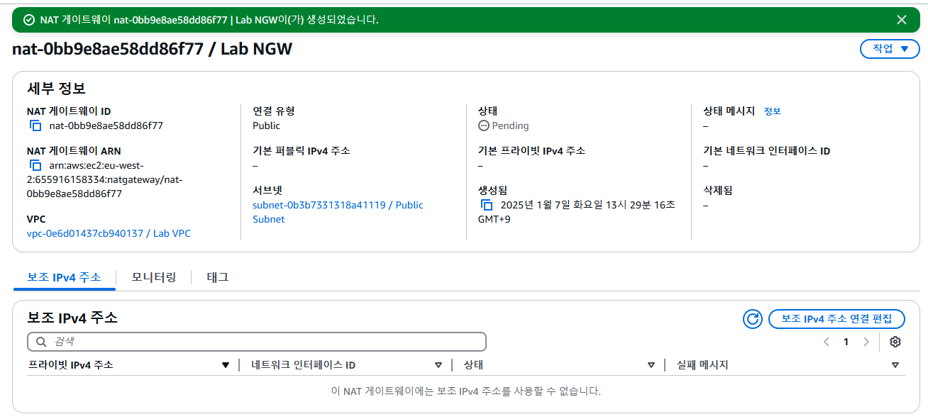 NAT gateway nat-xxxxxxx | Lab NGW was created successfully. 메세지가 화면 상단에 표시됩니다.
