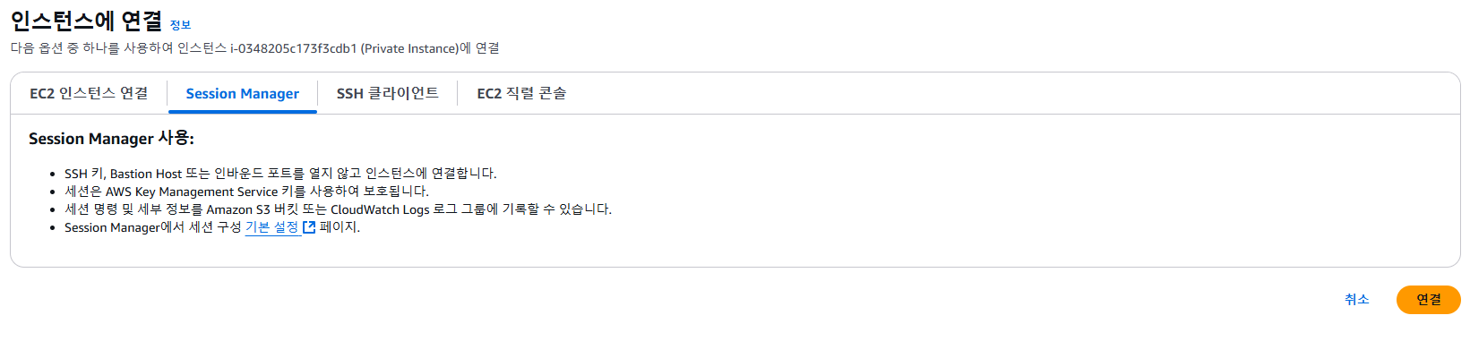 - AWS Systems Manager의 기능인 Session Manager 도구를 사용하여 Amazon EC2 인스턴스에 연결