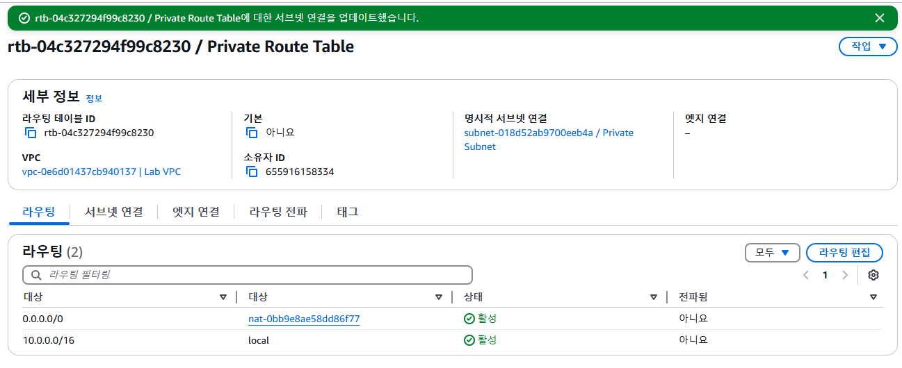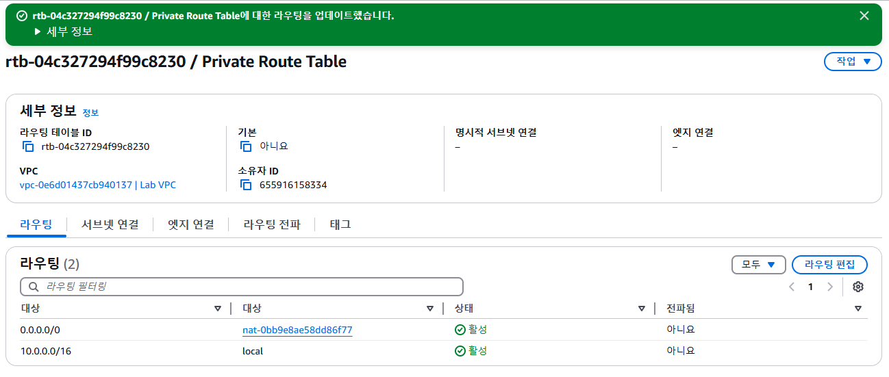 Updated routes for rtb-xxxxxxx / Private Route Table successfully 메세지가 화면 상단에 표시됩니다.