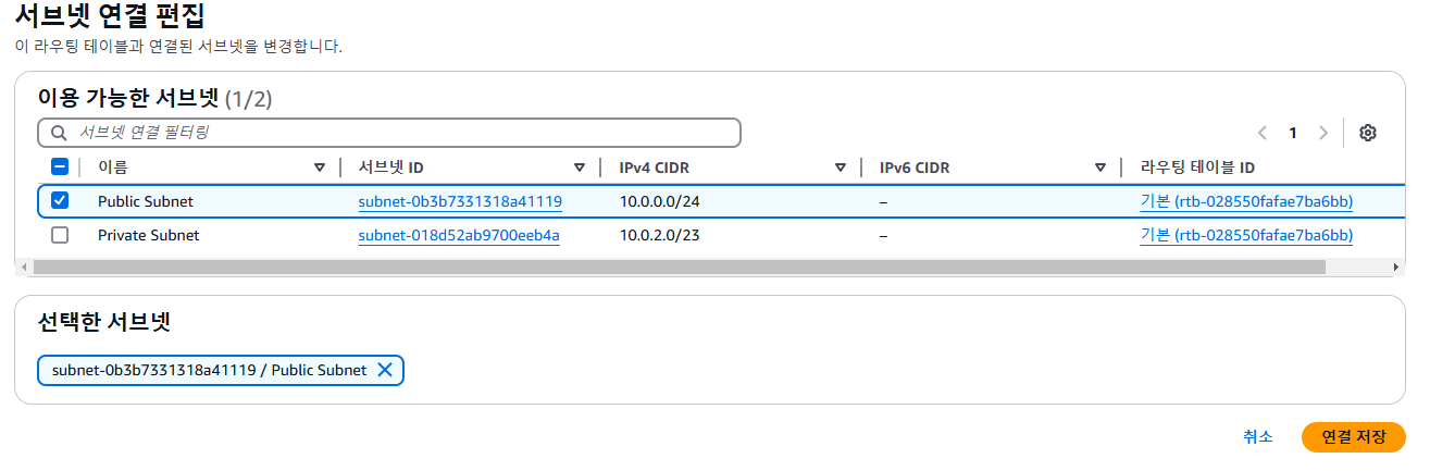 A You have successfully updated subnet associations for rtb-xxxxxxx / Public Route Table. 메세지가 화면 상단에 표시됩니다.