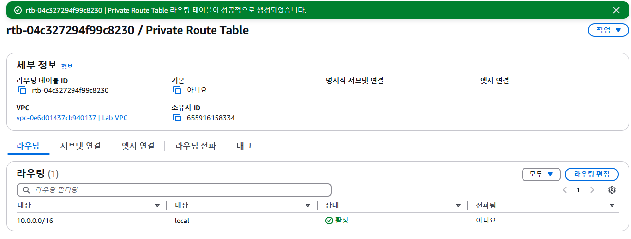 Route table rtb-xxxxxxx | Private Route Table was created successfully. 메세지가 화면 상단에 표시됩니다.