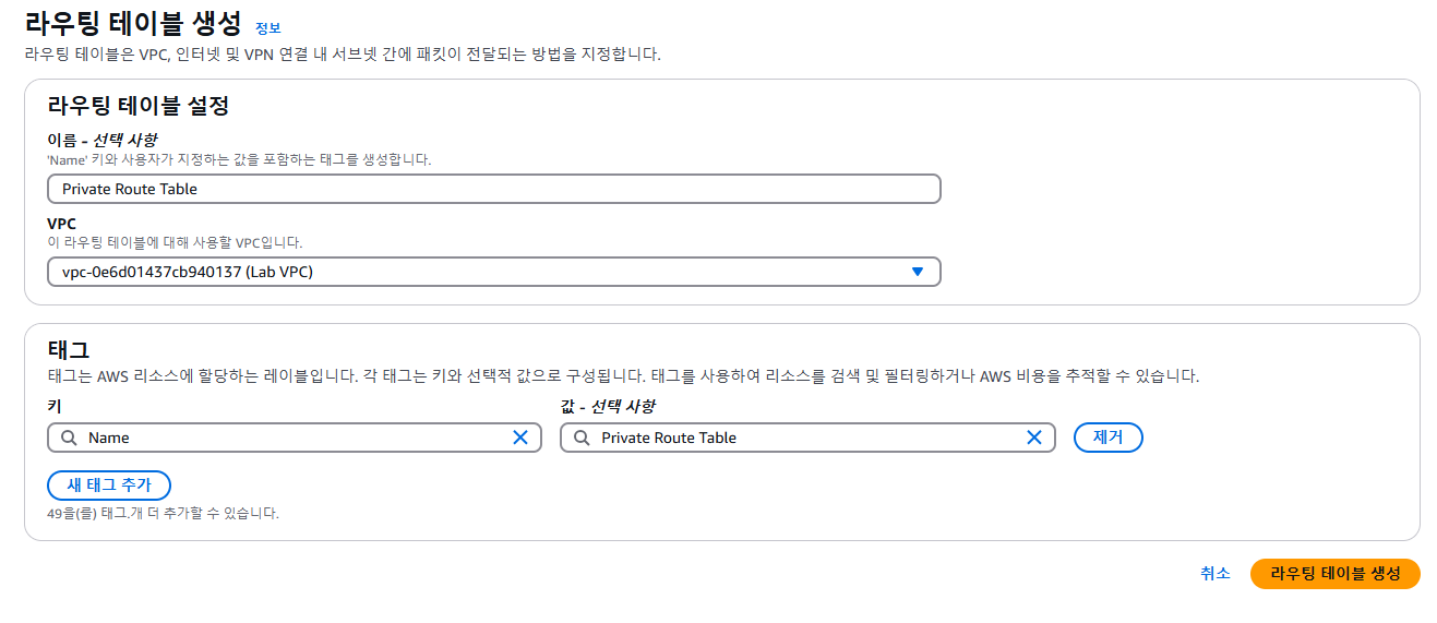 - Create route table을 선택하고 다음을 구성합니다.