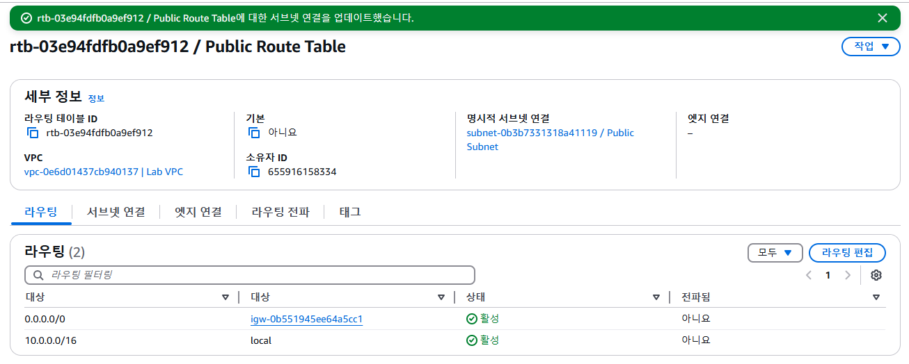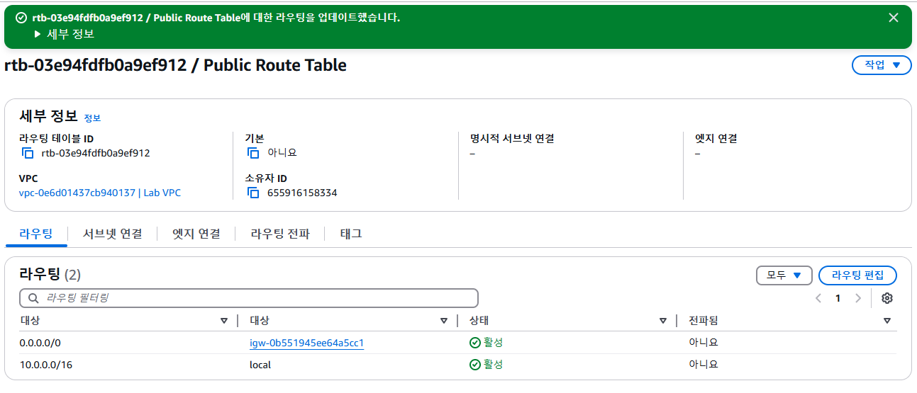 Updated routes for rtb-xxxxxxx / Public Route Table successfully 메세지가 화면 상단에 표시됩니다.