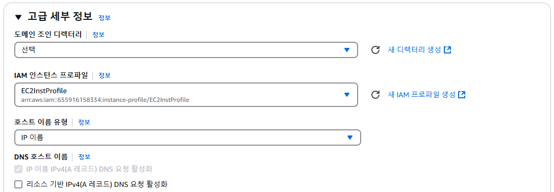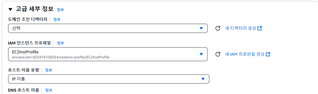- IAM instance profile 드롭다운 메뉴에서 EC2InstProfile과 같은 이름을 가진 역할을 선택합니다.