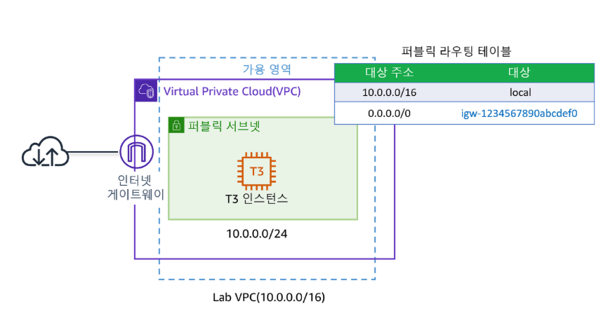 이제 Lab VPC에 인터넷 게이트웨이가 연결되었습니다. 인터넷 게이트웨이를 생성하여 VPC에 연결했어도 퍼블릭 서브넷 라우팅 테이블도 인터넷 게이트웨이를 사용하도록 구성해야 합니다.