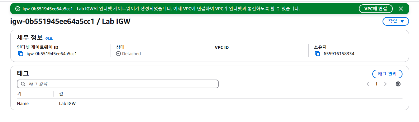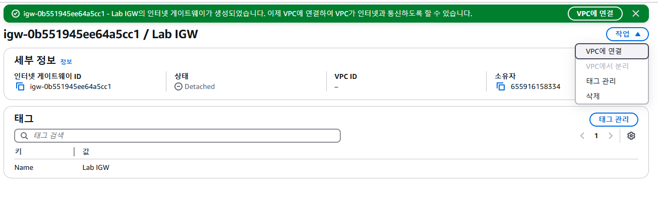 이제 사용자의 Lab VPC에 인터넷 게이트웨이를 연결할 수 있습니다.