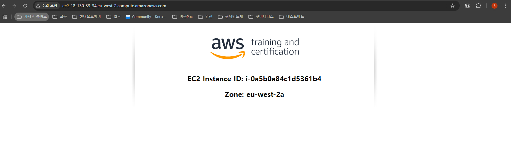 Amazon EC2 인스턴스에서 호스트되는 웹 페이지가 표시됩니다. 이 페이지에는 인스턴스 ID와 Amazon EC2 인스턴스가 있는 AWS 가용 영역이 표시됩니다.