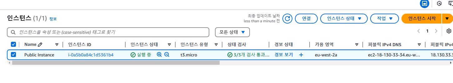 - 새로 고침 버튼 을 간간히 누르며 Public Instance의 Instance state가 Running으로 바뀝니다.