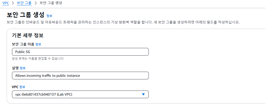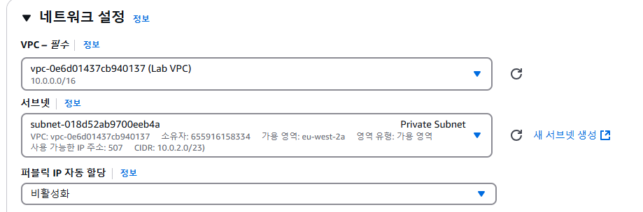 - VPC: 드롭다운 메뉴에서 Lab VPC를 선택합니다.