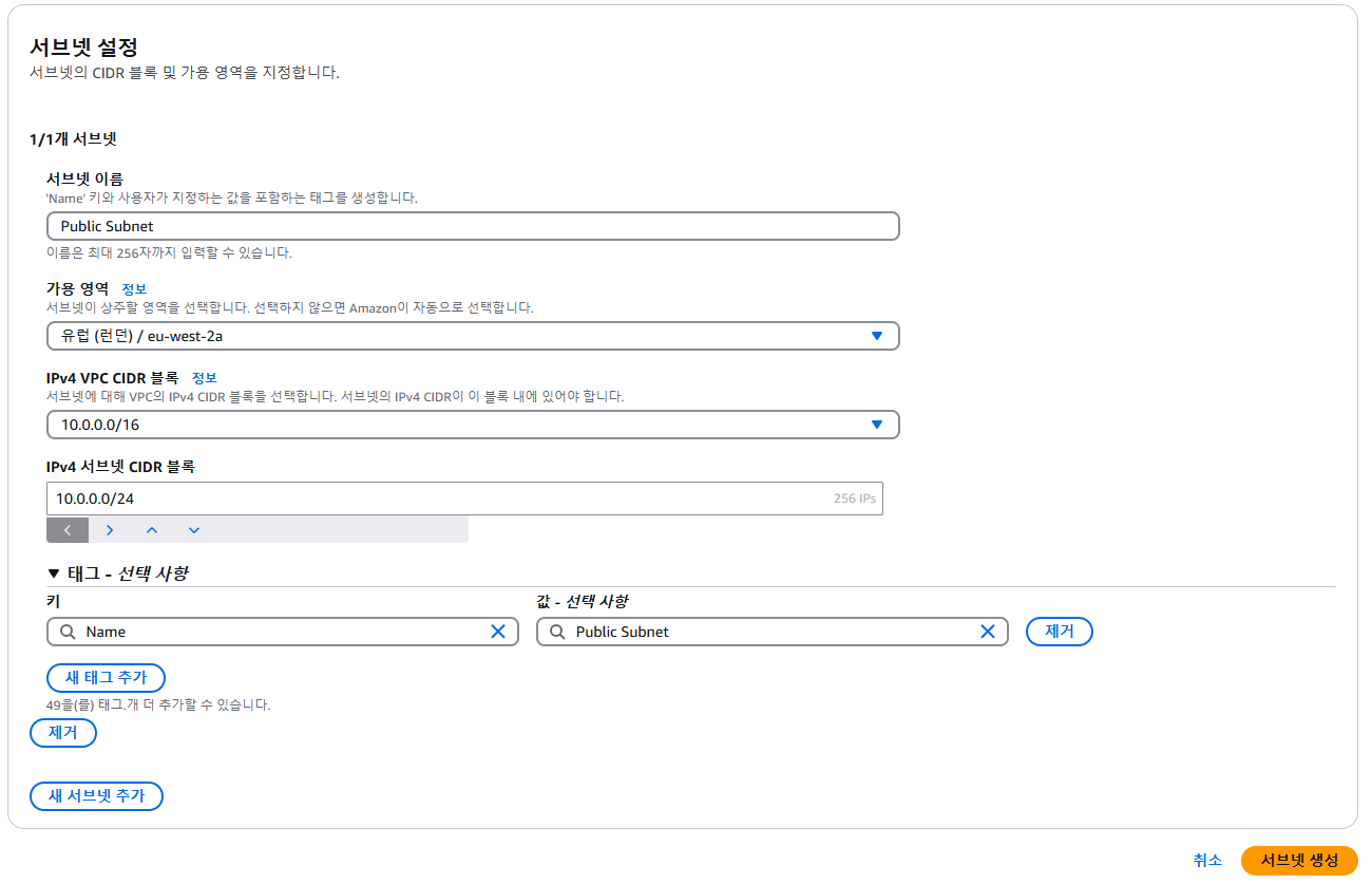 - Subnet name: Public Subne을 입력 합니다.