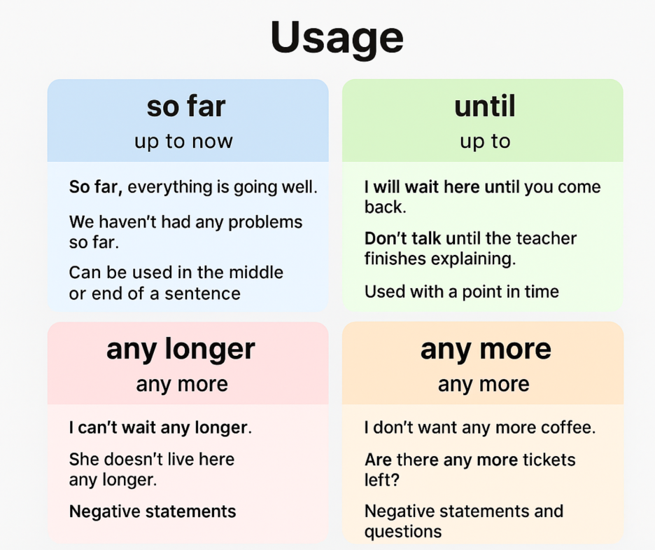 오늘의 주제는 so far, until, any longer, any more의 사용 방법과