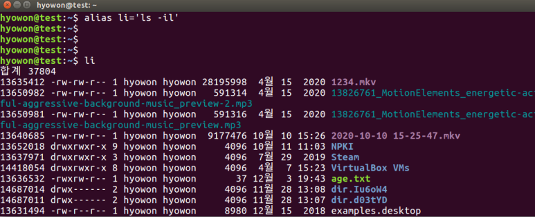 개인적으로 Alias를 생성하고 싶다면 아래와 같이 명령어를 입력하여 사용하면 됩니다. alias 사용할익명 명령어='실제 명령어와 옵션'