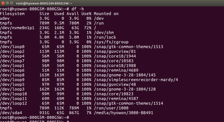 If you look at the df result above, it shows disk space information in kilo Byte units, which is a bit inconvenient for humans to see. In this case, if the -h option is used, the more readable jumbo megabytes are displayed in gigabyte units.